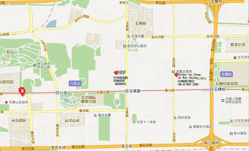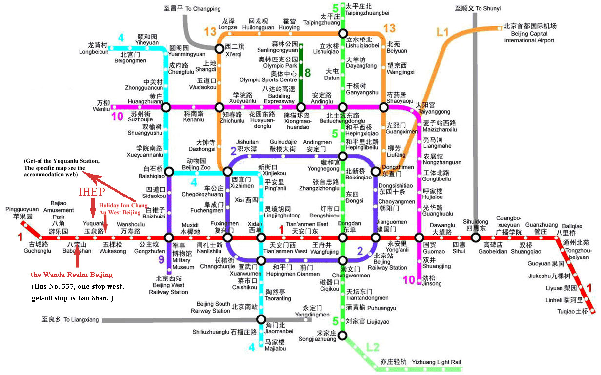 You can take Beijing Subway from the Airport Station to Dongzhimen Station, from which transfer to line 2. Then make another change from line 2 to line 1 at Jianguomen Station, Take the direction to Ping Guo Yuan and stop off at Yuquanlu Station. Take the north-west exit (Port A) and the IHEP campus is just at the north-west corner of the traffic cross. You can take the southern gate ( 300m west to the Subway Port A)【MAP】
