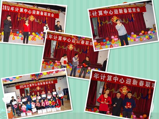 上午九点整,在中心全体员工、学生的热烈掌声中拉开了联欢会的序幕。首先陈刚主任向大家致新春致辞,表达了对全体员工的谢意与祝福,肯定了2012年度全体员工共同努力的成果,希望大家来年再接再厉,共创计算中心美好的未来!孙功星主任颁发了计算中心优秀员工奖,程耀东颁发计算中心“青年科技工作者园地”优秀报告奖。