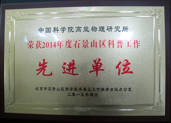 4月24日,石景山区科普工作联席会议办公室发布表彰决定,授予高能所“2014年度石景山区科普工作先进集体”称号,并颁发了奖牌。