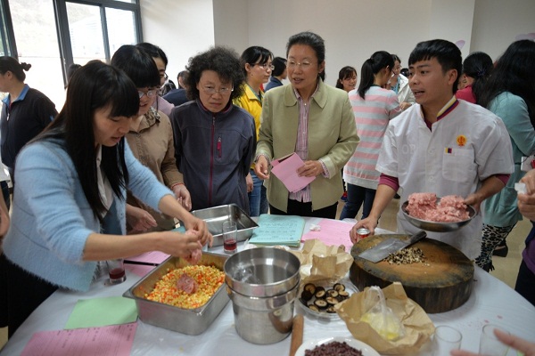 讲座结束后,组委会备好了亲手制作的点心,并由东方烹饪学校的李师傅现场教授60多名女职工分组制作广式点心,现场的气氛轻松而愉快,达到了活动的高潮。