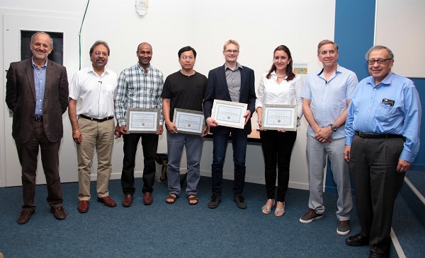 CMS国际合作组前任发言人(Guido Tonelli, Tejinder Virdee, Joe Incandela)和现任发言人(Joel Butler)为获奖者颁奖/左四为陈明水