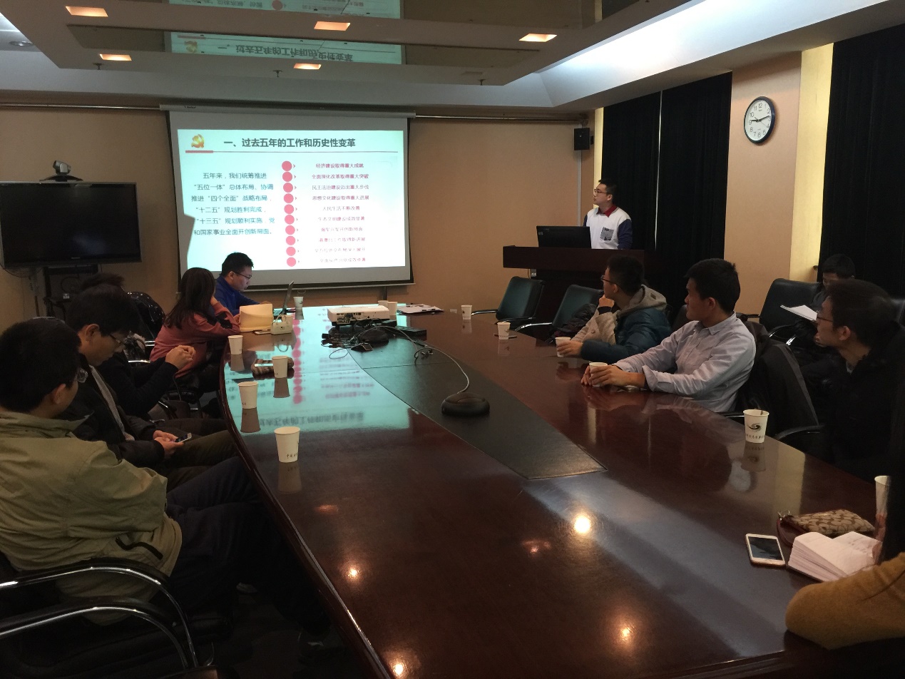 首先,王欢对此次组织生活会的主旨思想做了介绍,随后,由所团委委员郭聪为中心青年职工和学生讲授了题为“不忘初心牢记使命——深入学习贯彻十九大精神”的团课,该团课紧密围绕十九大报告、新党章等内容展开。授课结束后,与会的全体人员结合对十九大精神的理解,以及会前所学的《将改革进行到底》《辉煌中国》《不忘初心砥砺前行》政论专题片,交流了心得体会。宋黎明对学习情况进行了总结,并结合学生和青年职工的民主发言,提出了十九大精神与科研奋斗目标具体结合的实施理念。