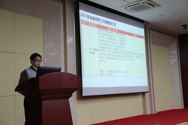 陈宏刚汇报了今年的工会工作。经审委主任张旌报告了工会经费使用情况以及工会财务报销的有关条例和标准。吴颖萍律师作了《如何做好工会工作》的报告,从“如何做好劳动争议调解工作、如何依法维护职工的合法权益和如何建设和谐劳动关系”三个方面进行了详细的介绍。职代会常委郭立军主持了“职工代表提案答复满意度调查”及评选最佳提案活动。