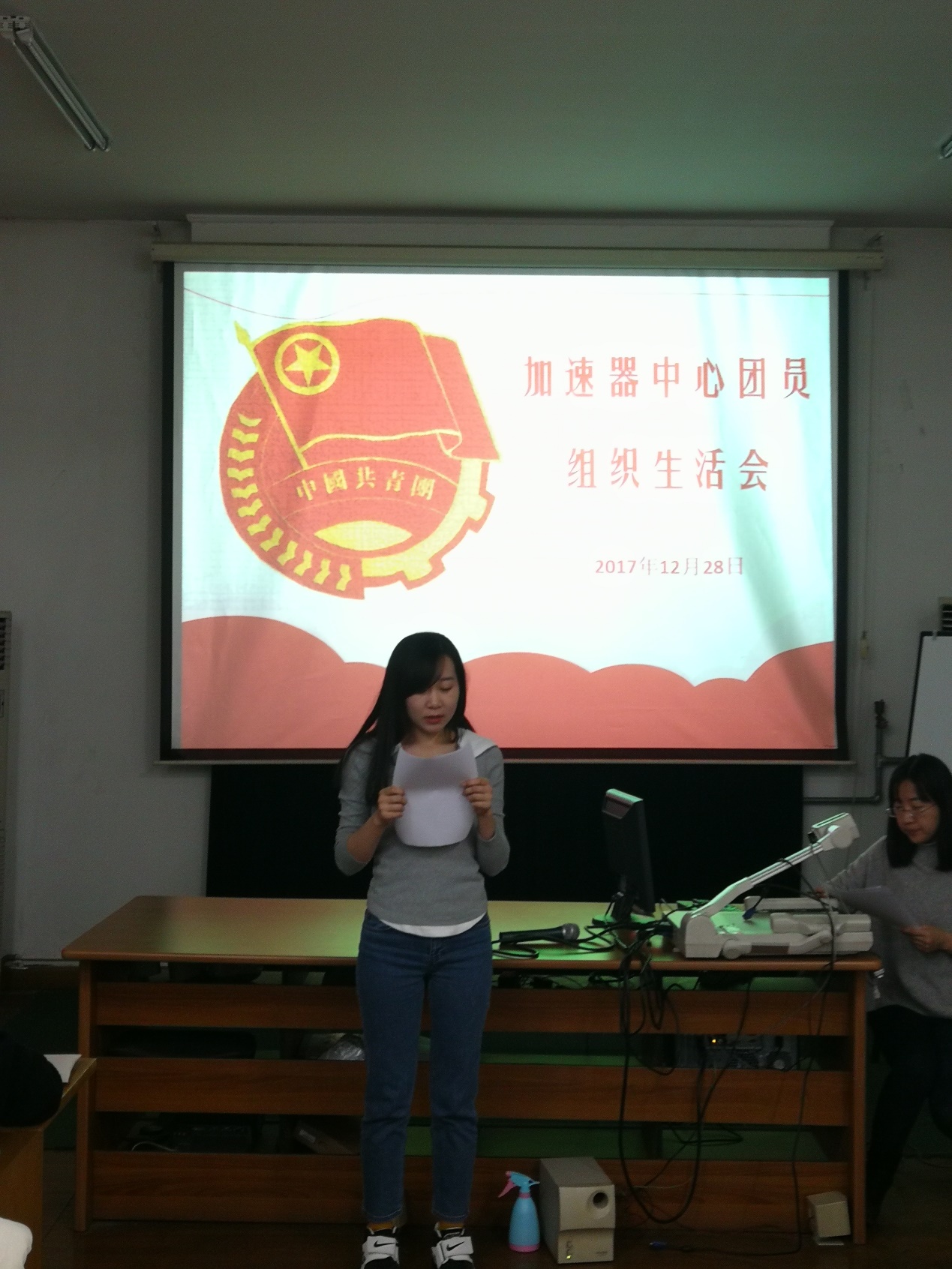2017年12月28日下午,加速器中心团支部召开了以“践行新思想,拥抱新时代”为主题的组织生活会,所团委副书记、加速器中心党总支青年委员王湘鉴、加速器中心团支部支部委员及团员参加了会议。