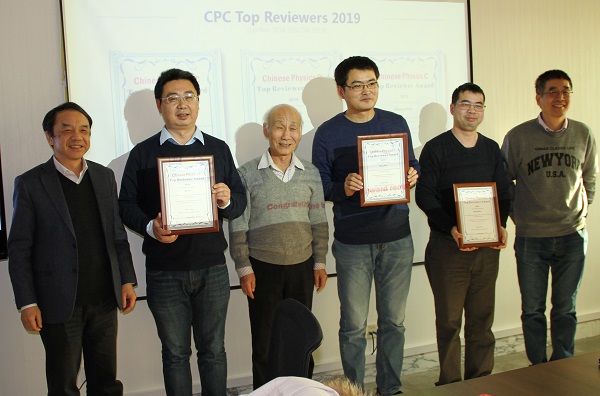 按照会议议程,编委会向2019年度优秀审稿人代表北京航空航天大学张玉洁教授、上海交通大学王伟教授和高能所贾宇教授颁发了荣誉证书,以感谢他们为《中国物理C》审稿工作做出的贡献。
