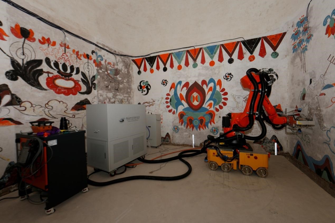 2016年,鉴于敦煌研究院对先进文物保护技术的需求以及高能所长期以来有为我国文化遗产保护贡献自身力量的意愿,双方签署了在文化遗产保护基础研究、文物保护装备研发、文物资源信息存贮、网络安全、实验室建设、人才培养及成果推广等领域开展合作的战略性框架协议。此后,高能所承担了敦煌研究院牵头的国家重点研发计划项目的课题,研发了具有完全自主知识产权的智能化移动式电子束辐照设备和空气消毒灭菌设备,用于洞窟和墓室壁画的灭菌保护。设备已在敦煌研究院构建的模拟墓室壁画实验现场做了示范应用与实践验证。