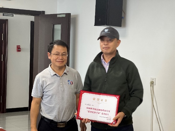 魏龙在讲话时高度评价了核技术应用研究中心离任党支部书记史戎坚及历届党支部的工作,充分肯定了他们在党建引领推动中心科技创新、学风作风建设、思政宣传教育、创新文化建设等方面做出的突出贡献。中心主任魏存峰代表中心行政领导班子对史戎坚及原支部的工作表示感谢,感谢他们在中心党建、党政配合等方面的辛勤付出和取得的优异成绩。随后,章志明代表所党办和核技术应用研究中心向史戎坚颁发了荣誉证书及纪念奖章,感谢他在任职期间的无私奉献和卓有成效的工作。