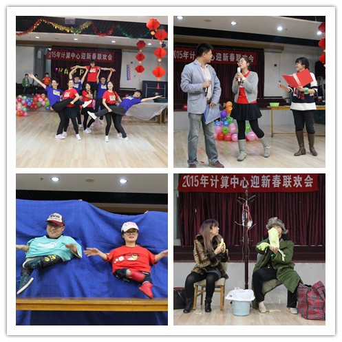 大家自筹经费来组织本次迎新春茶话会活动,大家相互话着家常,拉近了彼此心与心的距离。计算中心的年轻人表演了舞蹈“小苹果”、小品《非常勿扰》、趣味舞蹈《小人舞》、哑剧小品《逆袭》、好歌联唱等丰富多彩的节目,还组织了每个人都能参与的趣味游戏,让茶话会气氛热烈,高潮迭起,笑声不断。茶话会在《恭喜发财》、《难忘今宵》歌声中落下了帷幕。